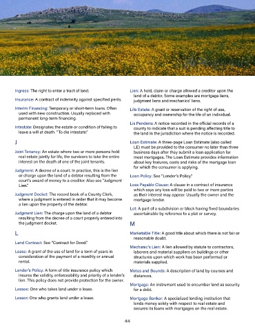 Ingress: The right to enter a tract of land� Lien: A hold, claim or charge allowed a creditor upon the